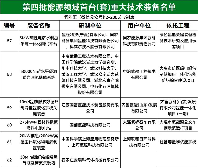 根据《第四批能源领域首台(套)重大技术装备名单》,其中6项氢能技术装备入选。这6套分别为一套5MW碱性电解水制氢系统测试平台、一套岩洞氢储能系统、一套10t/d氢膨胀氢液化系统关键装备、一套275kW钛基材料极板燃料电池电堆、20kW模组/200kW高温固体氧化物电解制氢装置、以及一套30MPa碳纤维缠绕氢气瓶及管束集装箱。