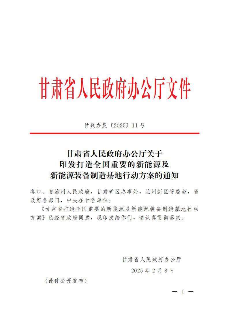 2月11日,甘肃省人民政府印发打造全国重要的新能源及新能源装备制造基地行动方案的通知。