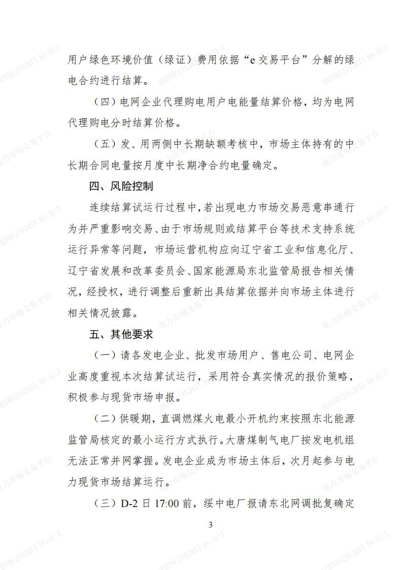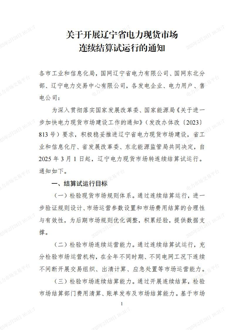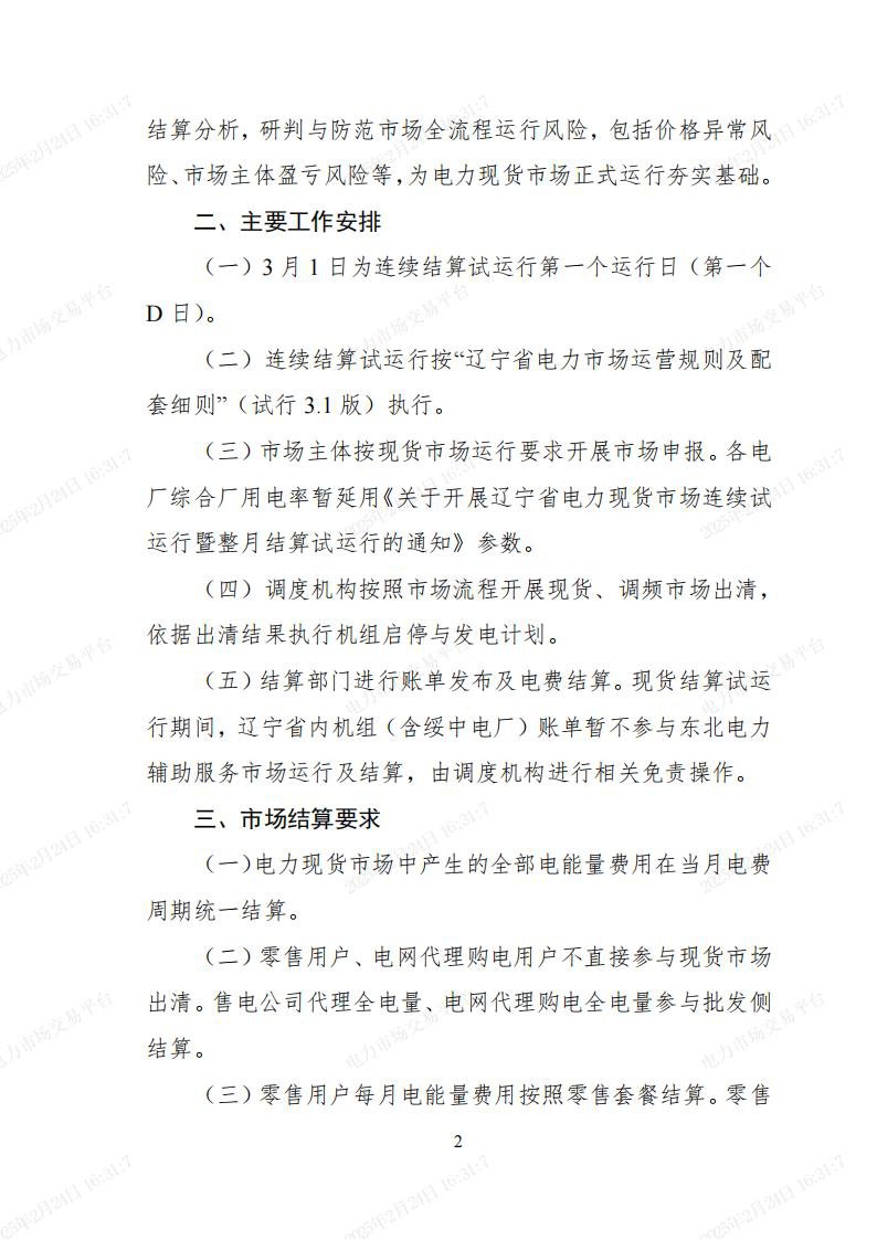 文件明确,3月1日为连续结算试运行第一个运行日(第一个D日)。连续结算试运行按“辽宁省电力市场运营规则及配套细则”(试行3.1版)执行。