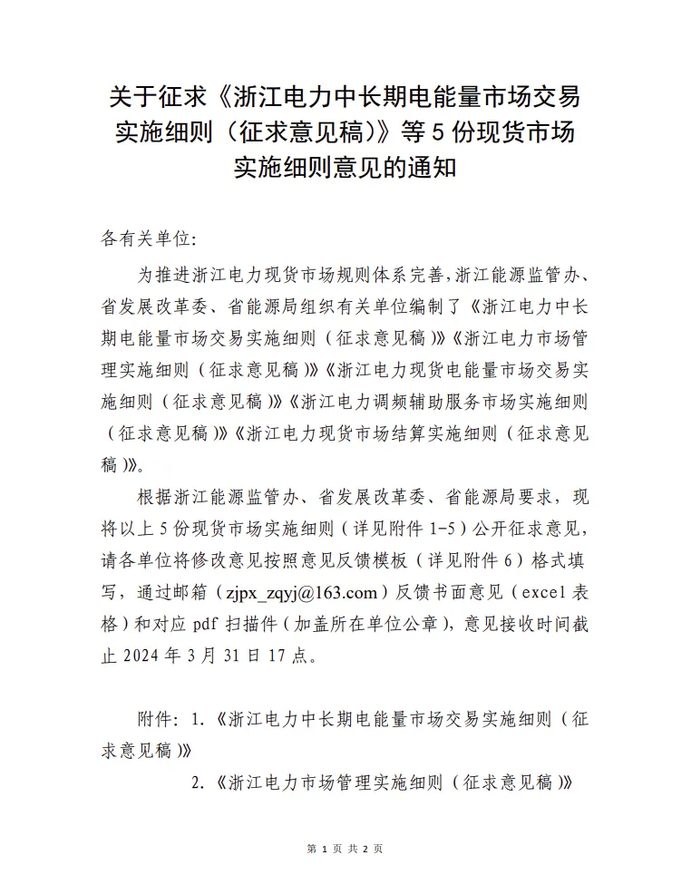 近日,浙江电力交易中心发布关于征求《浙江电力中长期电能量市场交易实施细则(征求意见稿)》等5份现货市场实施细则意见的通知。...