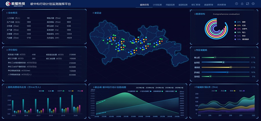 碳中和行动计划监测指挥平台采用大数据、物联网、碳排放计算模型等技术手段,根据国家政策,结合地方能源特点,综合考虑地区人口组成、能源生产结构、终端消费量、重点行业、规模及以上地区/企业碳排放、能源供给、能源消耗、企业分布、碳足迹、碳交易和碳汇储备等关键指标,构建本地区/本企业“碳中和”行动计划,从能源侧、企业侧、用户侧、管理侧提出切实可行的建议和实现途径,促进能源结构转型,优化重点行业生产用能结构,加快去碳化进度,促进碳中和的落地实施。