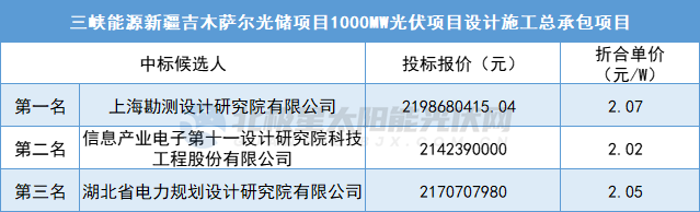 近日,三峡能源新疆吉木萨尔光储项目1000MW光伏项目设计施工总承包项目中标候选人公示,最低价仅2.02元/W。