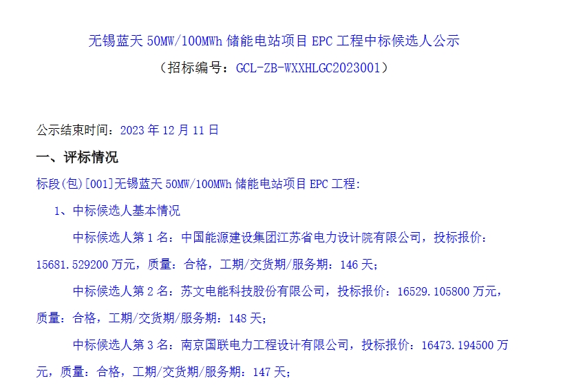 近日,无锡蓝天50MW/100MWh储能电站项目EPC工程中标候选人公示。公告显示,