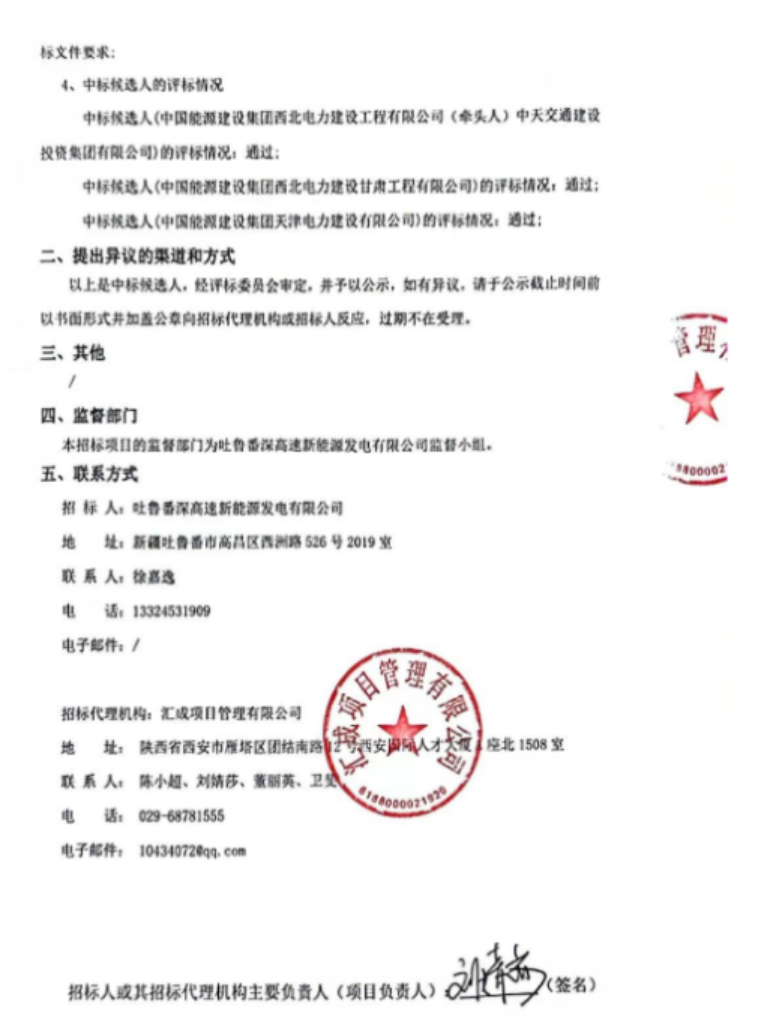 根据价格来看,中国能建西北电力建设工程有限公司&中天交通建设投资集团有限公司联合体以3.65元/瓦的最低报价位列第一中标候选人。