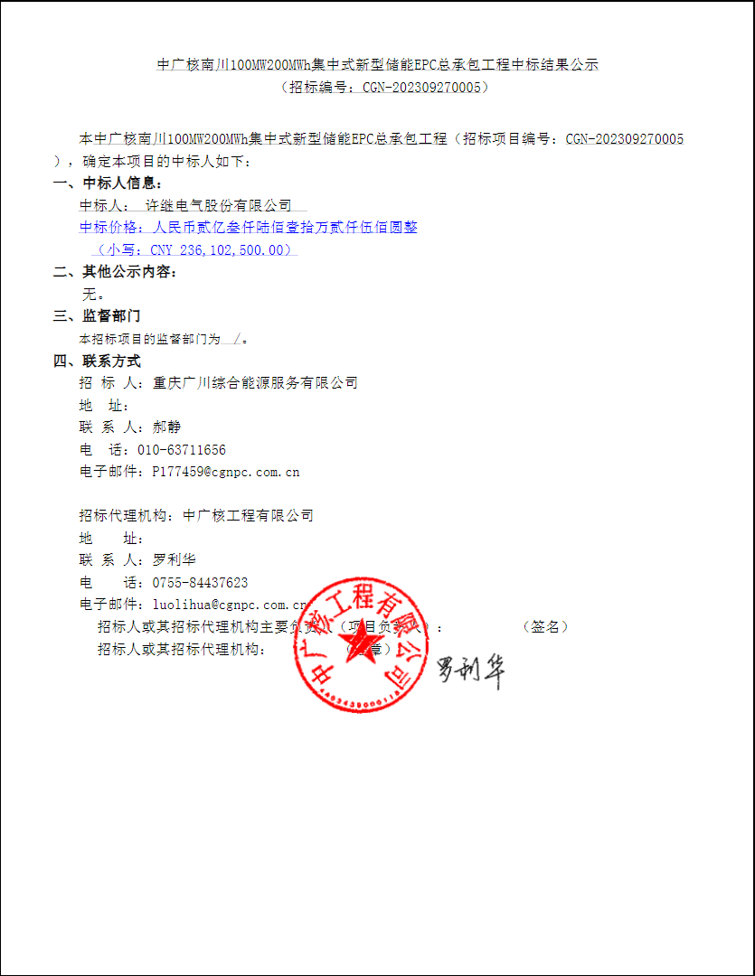 中广核南川100MW200MWh集中式新型储能EPC总承包工程的中标人为许继电气股份有限公司,投标价格为236102500元,折合单价1.18元/Wh。