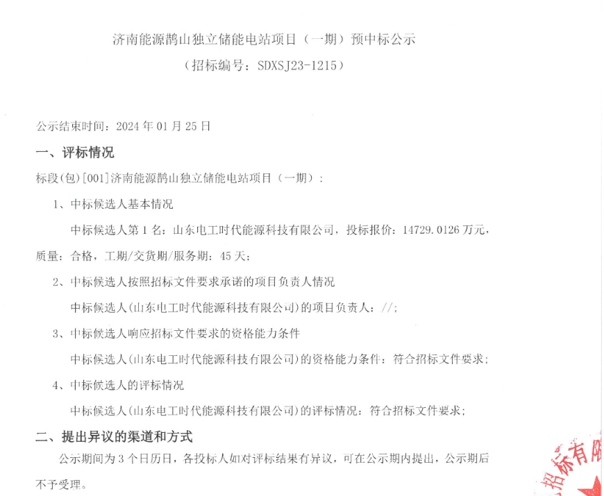 1月22日济南能源鹊山独立储能电站项目(一期)预中标公示发布。公告显示,山东电工时代能源科技有限公司预中标该项目,报价14729.0126万元,单价0.735元/Wh。
