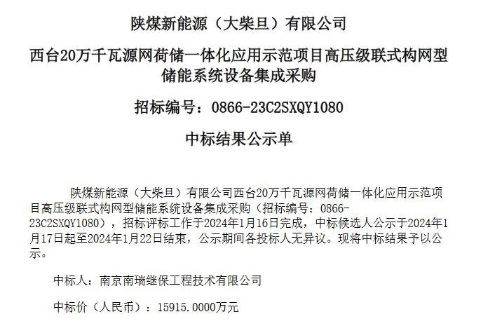 1月26日,陕煤新能源(大柴旦) 有限公司西台20万千瓦源网荷储一体化应用示范项目高压级联式构网型储能系统设备集成采购中标结果公布,南京南瑞继保工程技术有限公司以15915万元中标该项目,折合单价0.99元/Wh。