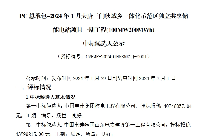 1月29日大唐集团发布月大唐三门峡城乡一体化示范区独立共享储能电站项目一期工程(100MW/200MWh)PC总承包中标候选人公示。中标候选人情况如下: