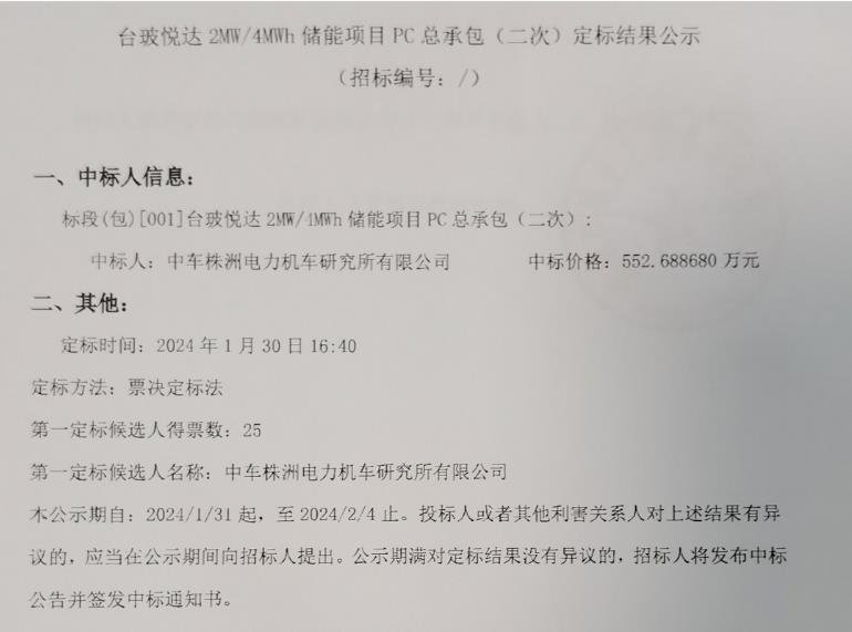 1月31日,台玻悦达2MW/4MWh储能项目PC总承包(二次)定标结果公示发布,中车株洲电力机车研究所有限公司以552.688680 万元中标该项目,折合单价1.382元/Wh。