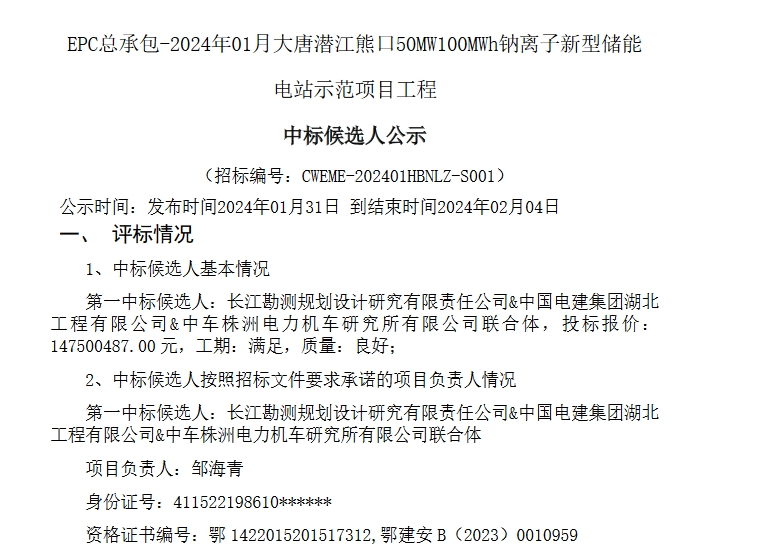 近日,大唐集团发布大唐潜江熊口50MW/100MWh钠离子新型储能电站示范项目工程EPC中标候选人公示。公告显示 ,