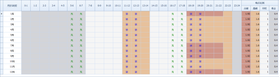参照工业用电分时时段数据对全年电价分时时段和浮动系数进行图示如下: