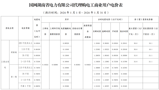 国网湖南2024年1月工商业电价标准