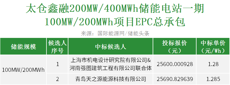 公告显示,第一中标候选人为上海市机电设计研究院有限公司&河南强图建筑工程有限公司联合体,投标报价25600.000928万元,单价为1.28元/Wh;第二中标候选人为青岛天之源能源科技有限公司,投标报价25690.829639万元,单价为1.285元/Wh。