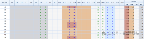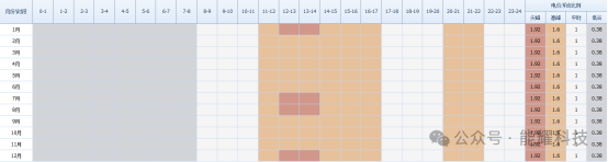 参照用电分时时段数据对全年电价分时时段和浮动比例进行图示如下: