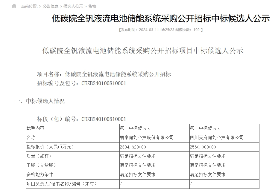 3月11日,国家能源集团发布低碳院全钒液流电池储能系统采购公开招标中标候选人公示。中标候选人情况如下: