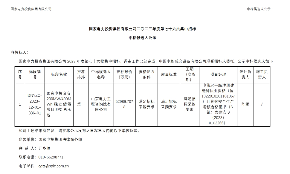 3月26日国家电投发布国家电力投资集团有限公司二〇二三年度第76批集中招标国家电投滨海200MW400MWh独立储能项目EPC总承包中标候选人公示。公告显示,山东电力工程咨询院有限公司预中标该项目,报价52989.7078万元,折合单价1.325元/Wh。