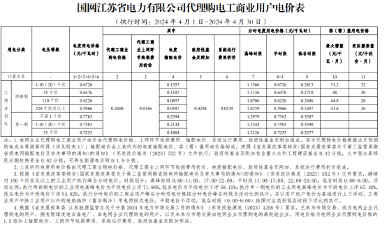国网江苏2024年4月工商业电价标准