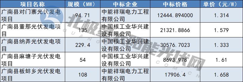 4月2日,中核集团广南县621MW光伏电站EPC中标结果公布,中标企业有中能祥瑞电力工程有限公司、中国核工业华兴建设有限公司,单价分别为1.314元/W、1.579元/W、1.333元/W、1.61元/W、1.658元/W。
