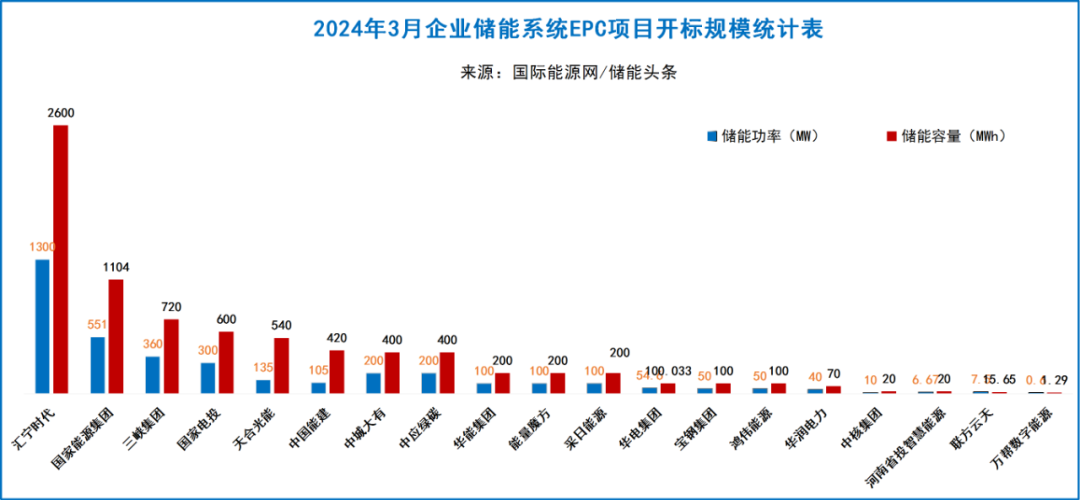 3月,23家业主发布了储能中标结果,汇宁时代开标规模最大,为2600MWh,其次是国家能源集团,开标规模为1710MWh。