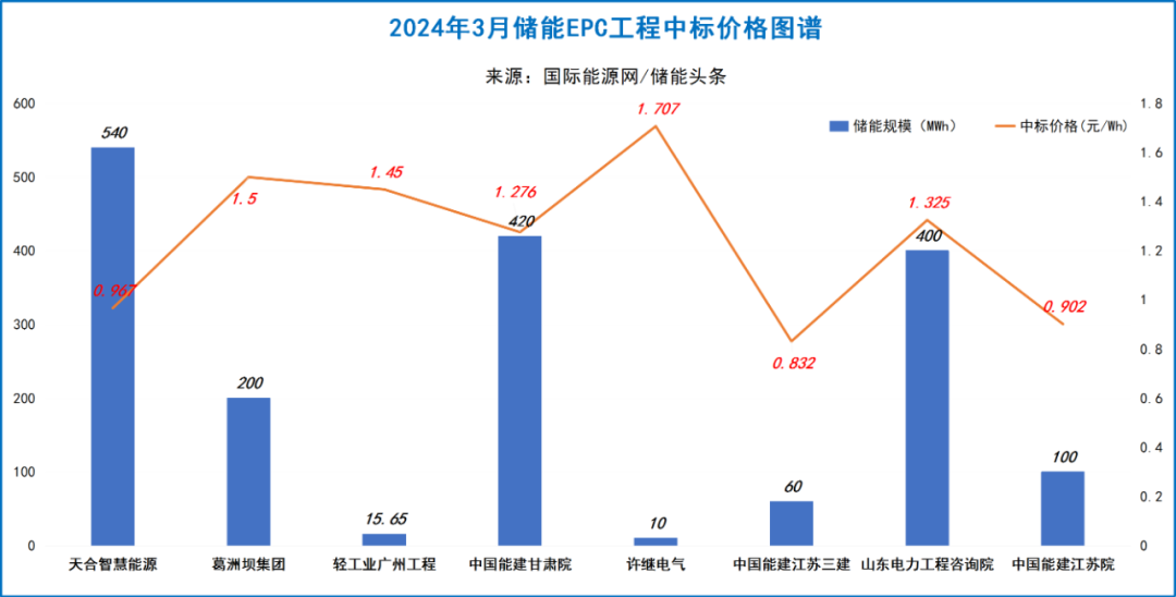从价格来看,最高价来自华润肇庆怀集润洲100MW复合光伏电站项目配套储能系统EPC总承包,中标价为1.707元/Wh;最低价为中国能源建设集团江苏省电力建设第三工程有限公司以0.832元/Wh的价格中标华润电力桦南一期300MW风电项目配套30MW(60MWh)储能系统EPC总承包工程。