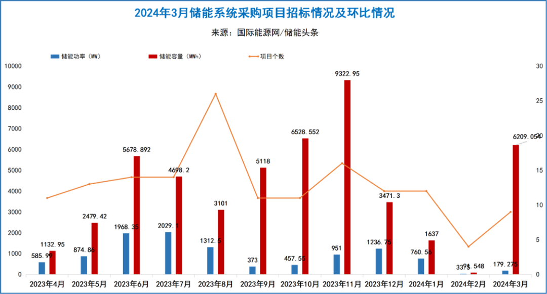 3月中核集团、国能信控、山东高速等业主发布了9个储能采购招标项目,招标规模为179.275MW/6209.054MWh。项目数量和规模都较上月大幅上涨。