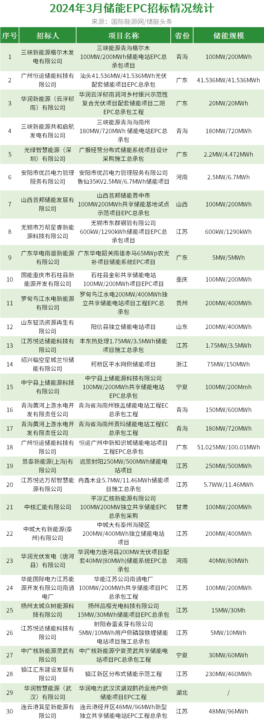 据国际能源网/储能头条(微信号chuneng365)统计,3月共有24个储能系统EPC中标项目,中标规模合计3670.37MW/7811.963MWh。