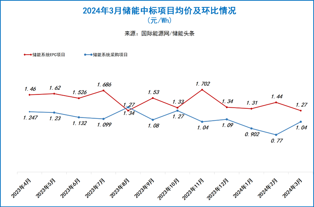 从中标结果来看,3月份储能系统采购均价在1.04元/Wh左右,相比上月价格略微上涨;储能系统EPC的均价为1.27元/Wh,比上月有所下滑。