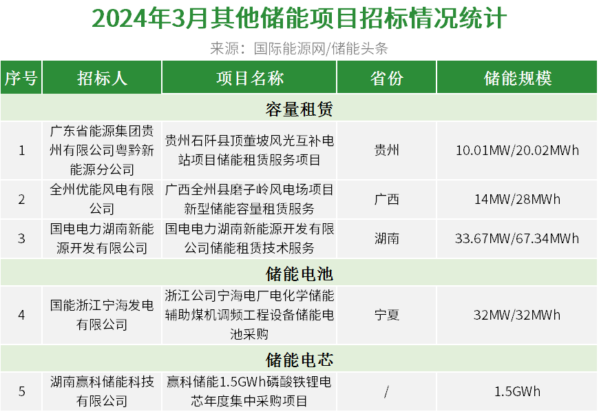 据国际能源网/储能头条(微信号chuneng365)统计,3月还发布储能租赁招标项目2个,储能电池招标项目1个,储能电芯招标项目1个。