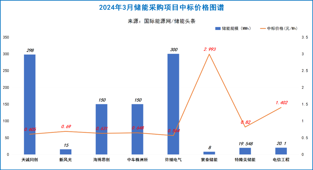 从已公布的价格来看,最高价来自的低碳院全钒液流电池储能系统采购项目,寰泰储能科技股份有限公司报价2.993元/Wh,比2月最高价低1.6元/Wh;最低价来自新疆立新能源奇台县12.5万千瓦储能+50万千瓦(风光同场)新能源项目储能系统设备采购,同样是许继电气股份有限公司报价,单价0.564元/Wh。
