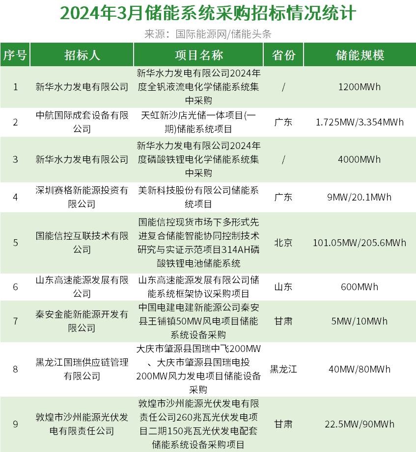 据国际能源网/储能头条(微信号chuneng365)统计,3月共有9个储能系统采购中标项目,中标规模合计406MW/1002.648MWh。