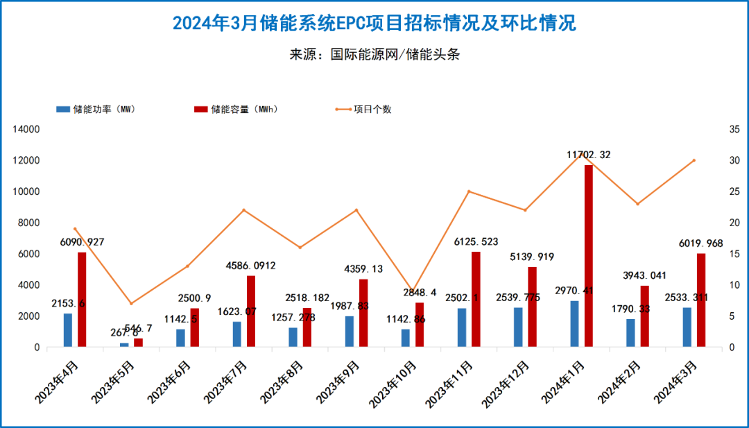 根据国际能源网/储能头条(微信号chuneng365)统计,2024年3月1日-31日行业内共发布储能中标项目累计33个,规模合计4076.37MW/10214.611MWh,其中,储能EPC开标项目24个,占比超50%;储能系统开标项目8个,容量规模为1.01GWh;另外有1个1.4GWh的直流侧集采框采。