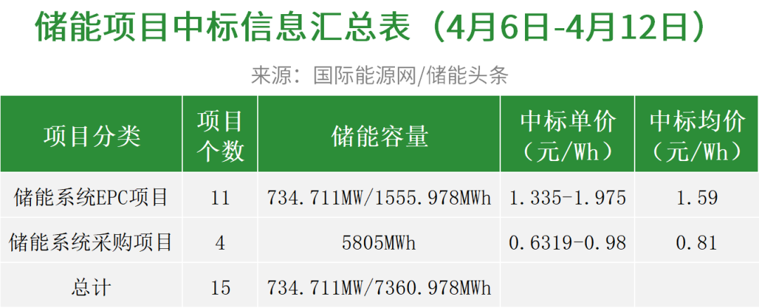 对近期(4月6日-4月12日)储能系统EPC/采购招中标项目不完全统计,本周共有招标项目9个,规模合计461.896MW/911.432MWh,中标项目15个,规模合计734.711MW/7360.978MWh,招中标规模合计1196.607MW/8272.41MWh。