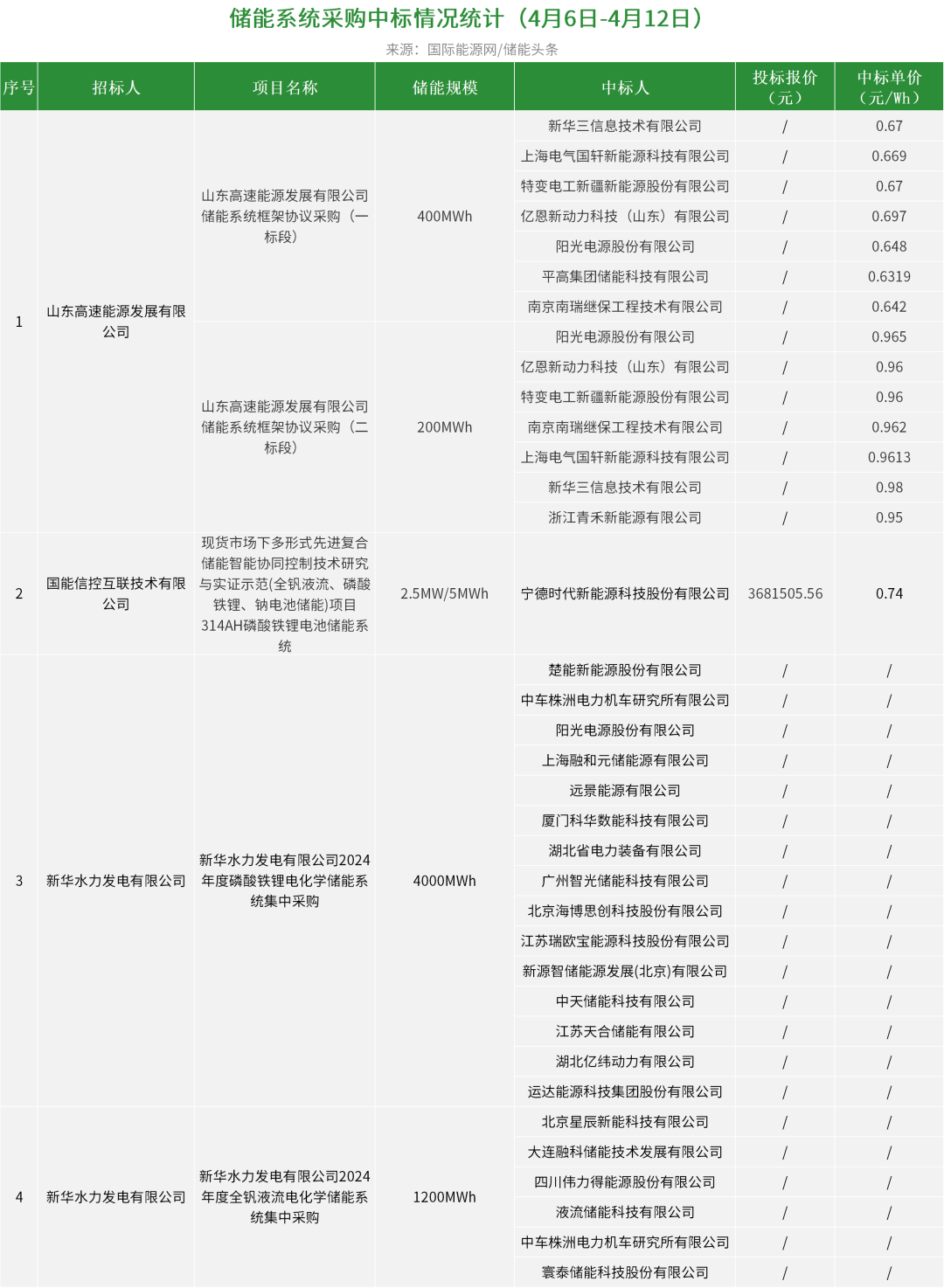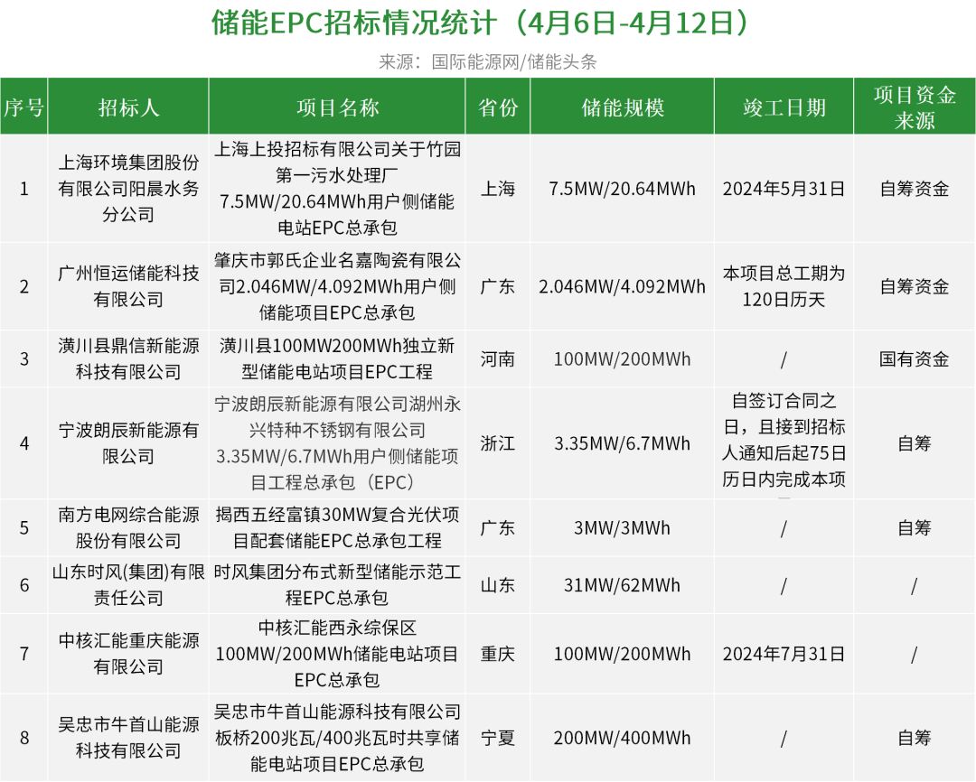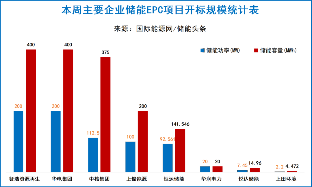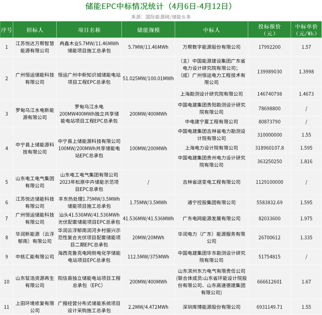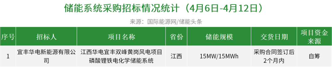 华电集团有1个项目开标,总规模为200MW/400MWh,中国电建贵阳院、中电建宁夏工程预中标;