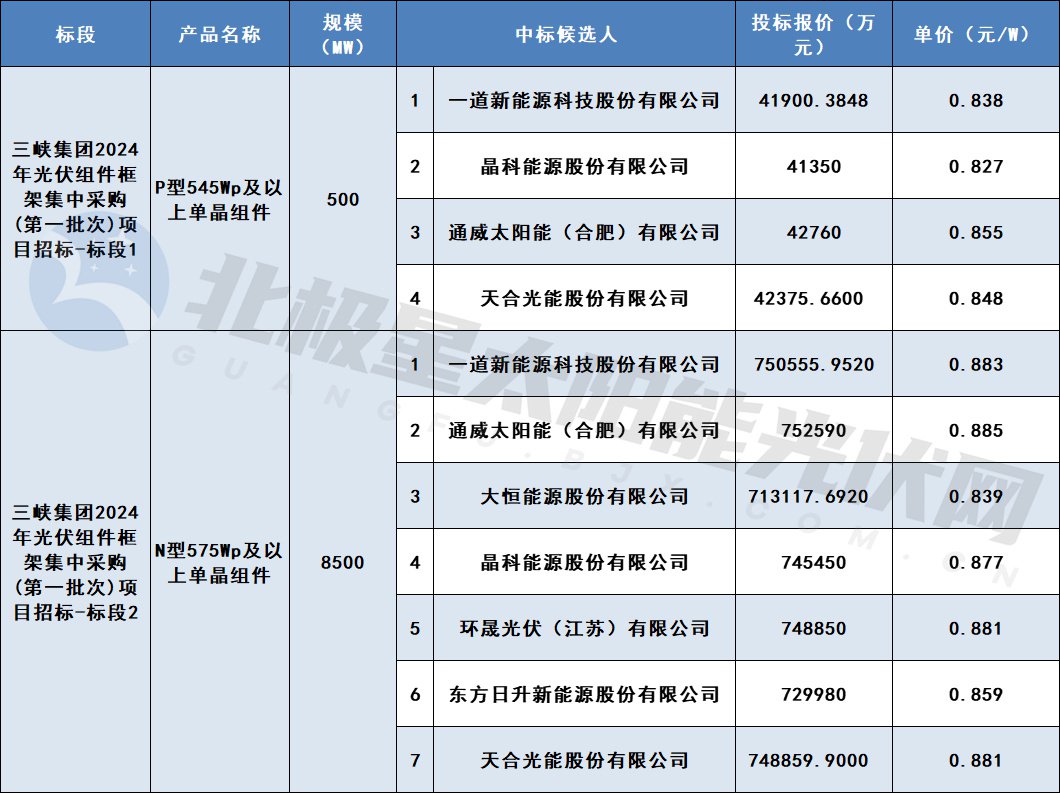 4月15日,三峡集团2024年光伏组件框架集中采购(第一批次)中标候选人公布,7家企业入围,分别是一道新能源科技股份有限公司、晶科能源股份有限公司、通威太阳能(合肥)有限公司、天合光能股份有限公司、大恒能源股份有限公司、环晟光伏(江苏)有限公司、东方日升新能源股份有限公司,其中,标段1入围企业来自于一道新能源科技股份有限公司、晶科能源股份有限公司、通威太阳能(合肥)有限公司、天合光能股份有限公司,标段2入围企业来自于一道新能源科技股份有限公司、通威太阳能(合肥)有限公司、大恒能源股份有限公司、晶科能源股份有限公司、环晟光伏(江苏)有限公司、东方日升新能源股份有限公司、天合光能股份有限公司。