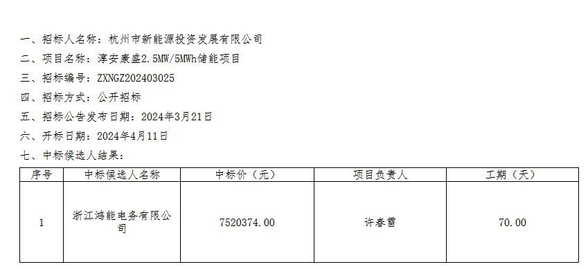 4月23日,浙江省杭州市淳安康盛2.5MW/5MWh储能项目中标候选人公示发布,浙江鸿能电务有限公司以7520374元预中标该项目,折合单价1.504元/Wh。