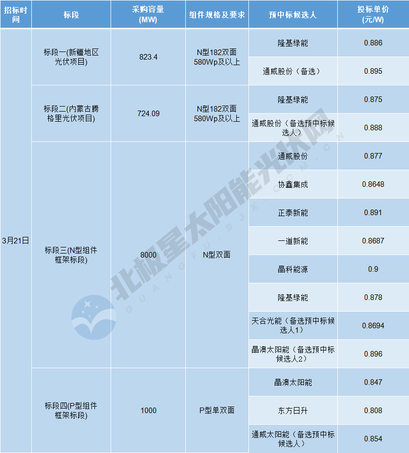 标段四:P型组件框架标段,招标容量1GW,预中标候选人为晶澳太阳能、东方日升,备选预中标候选人为通威太阳能,投标单价在0.808~0.854元/W。