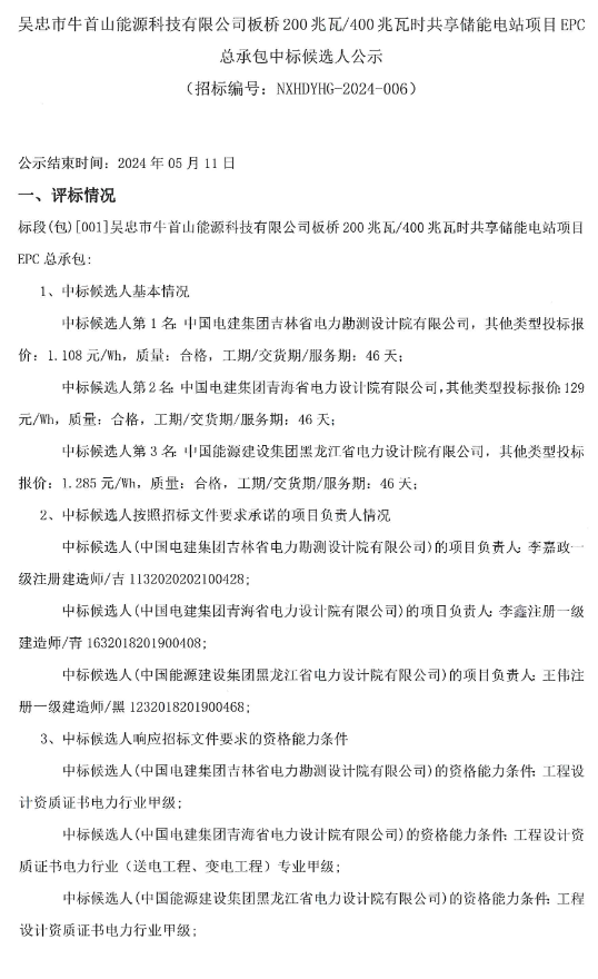 5月8日,吴忠市牛首山能源科技有限公司板桥200兆瓦/400兆瓦时共享储能电站项目EPC总承包中标候选人公示。