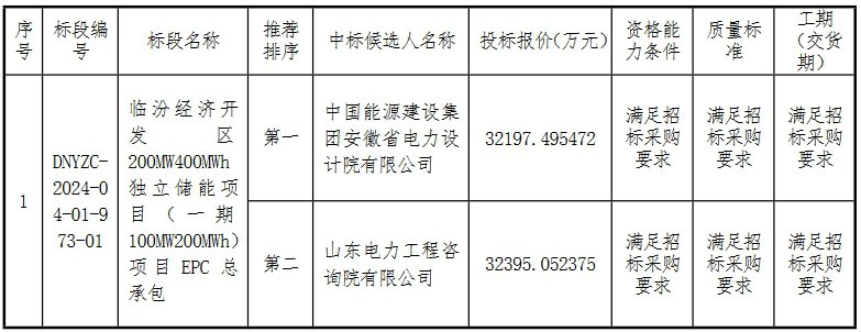 第一中标候选人为中国能源建设集团安徽省电力设计院有限公司,投标报价32197.495472万元,折合单价1.61元/Wh;