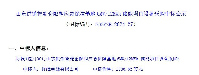 5月15日,山东供销智能仓配和应急保障基地6MW/12MWh储能项目设备采购中标公示发布,许继电气控股子公司许继电源有限公司以2886.65万元中标该项目,折合单价2.406元/Wh。
