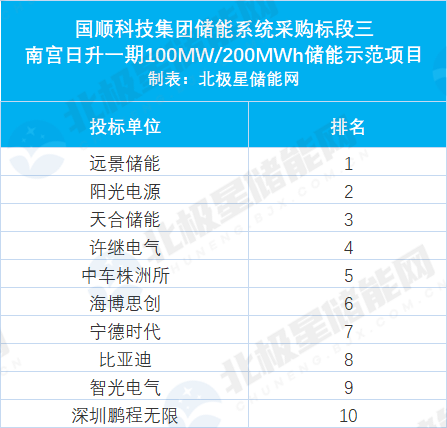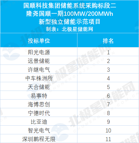 二标段为隆尧国顺300MW/600MWh(一期100MW/200MWh)新型独立储能示范项目;共吸引了11家储能系统集成商参与投标,分别为阳光电源、远景储能、许继电气、中车株洲所、天合储能、易事特、海博思创、宁德时代、比亚迪、智光电气、深圳鹏程无限新能源。
