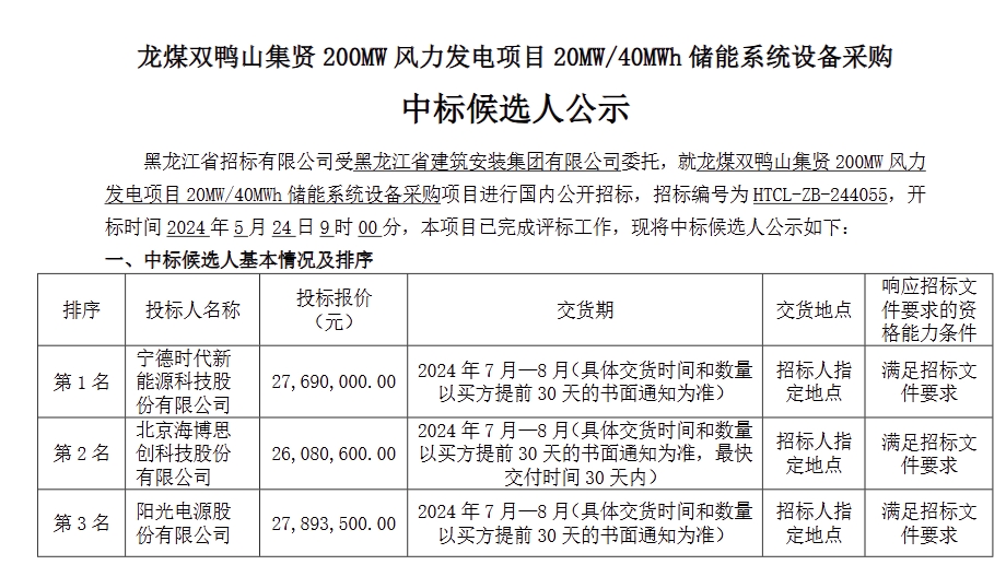 5月24日,黑龙江龙煤双鸭山集贤200MW风力发电项目20MW/40MWh储能系统设备采购中标候选人公示。中标候选人情况如下: