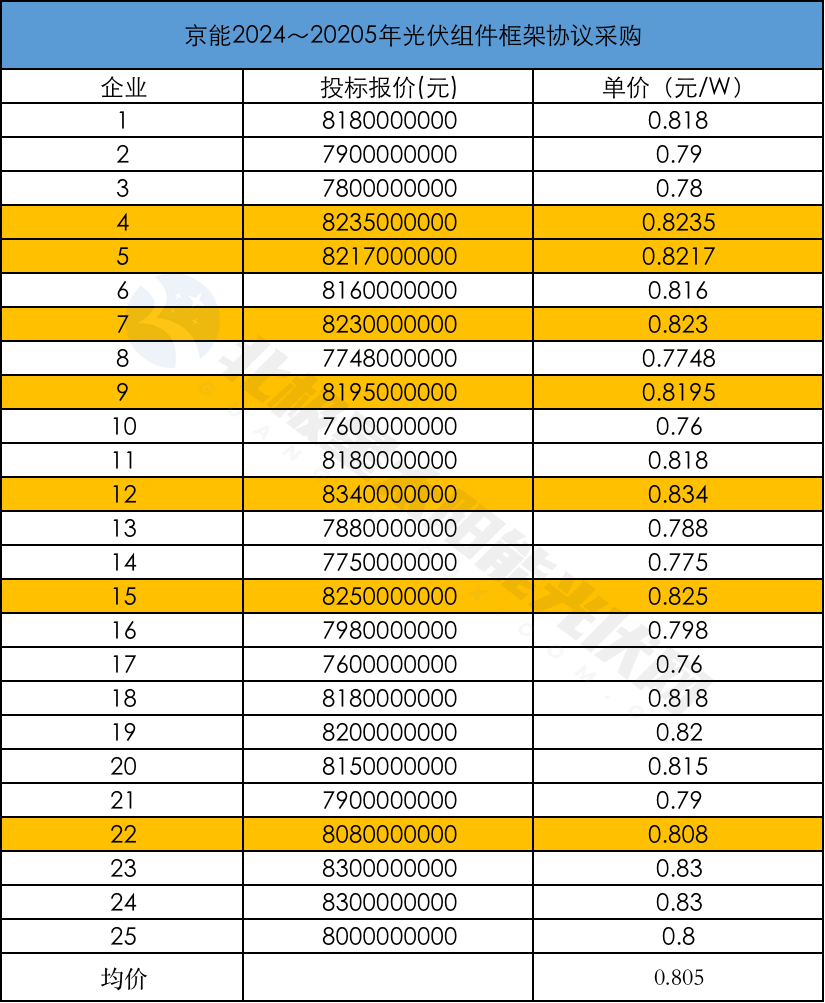 从开标情况来看,共有25家企业参与投标,价格更是再次创下新低。具体来看,25家企业的投标均价为0.805元/W,其中9家企业的单瓦投标价低于0.8元,最低0.76元/W;TOP7组件企业投标价高于均价,但也有一家企业直逼均价,最低0.808元/W,最高0.8235元/W。