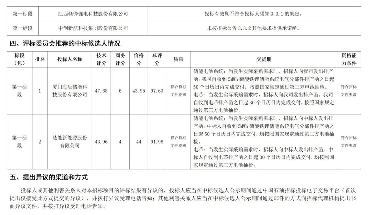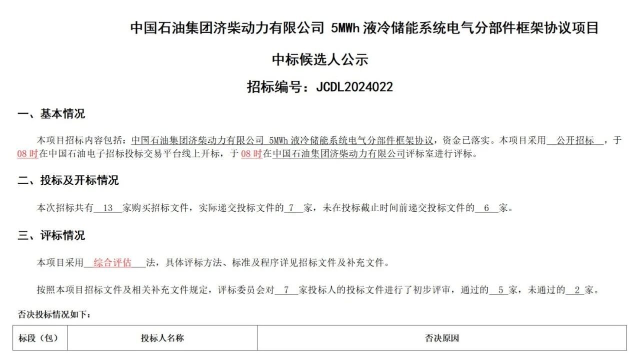 5月29日,中国石油济柴动力5MWh液冷储能系统部件框采中标候选人公示,据悉,海辰储能、楚能新能源、鹏辉能源、瑞浦兰钧、天合储能、中创恒盛和赣锋锂电共7家企业参与投标。其中中创恒盛和赣锋锂电被否决,最终海辰储能、楚能新能源分别为第一、第二中标候选人。