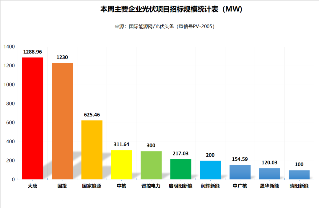 具体到本周的招标市场,大唐以1288.96MW排名第一。国投集团以容量1230MW,排名本周第二。国家能源集团则以625.46MW位列第三。