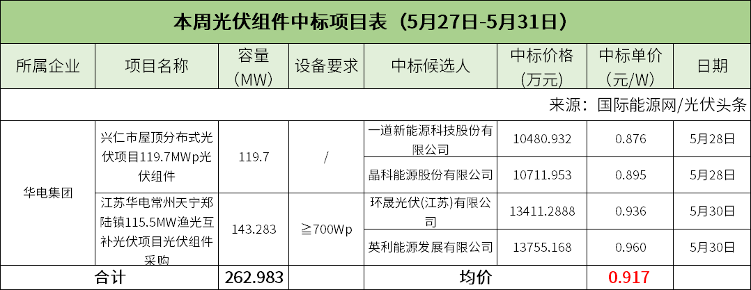 本周华电集团两个光伏组件采购项目明确中标价格,中标均价为0.917元/W。