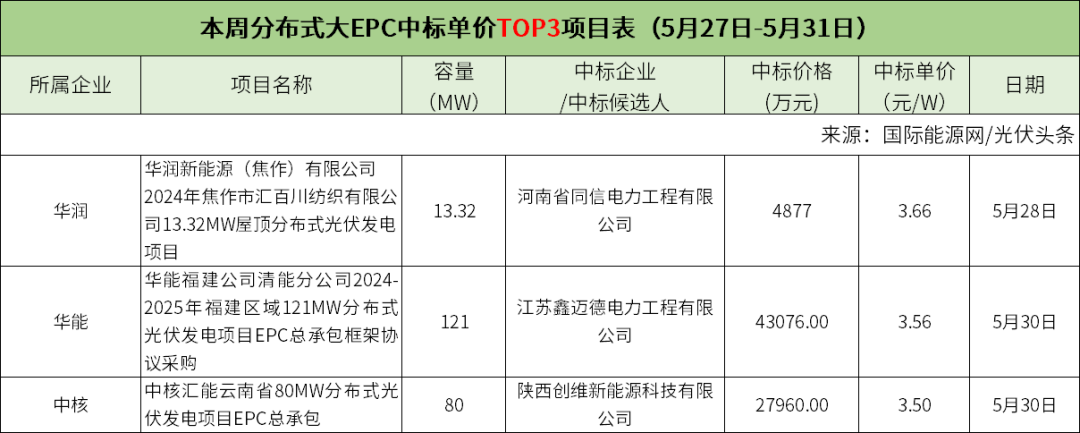本周分布式大EPC中标单价最高项目是华润新能源(焦作)有限公司2024年焦作市汇百川纺织有限公司13.32MW屋顶分布式光伏发电项目。本项目招标范围包括包括勘察、设计、设备采购、厂房加固、彩钢板更换、设备验收、运输及储存、设备供货、建设、安装、继电保护定值计算(含电网侧)、并网接入、试验、调试(含并网相关试验、调试)、试运行、竣工验收及设备资料、竣工资料、消缺、培训和最终交付等所有工作。
