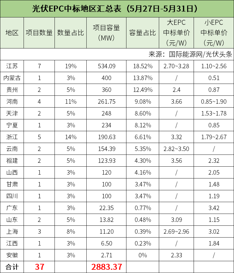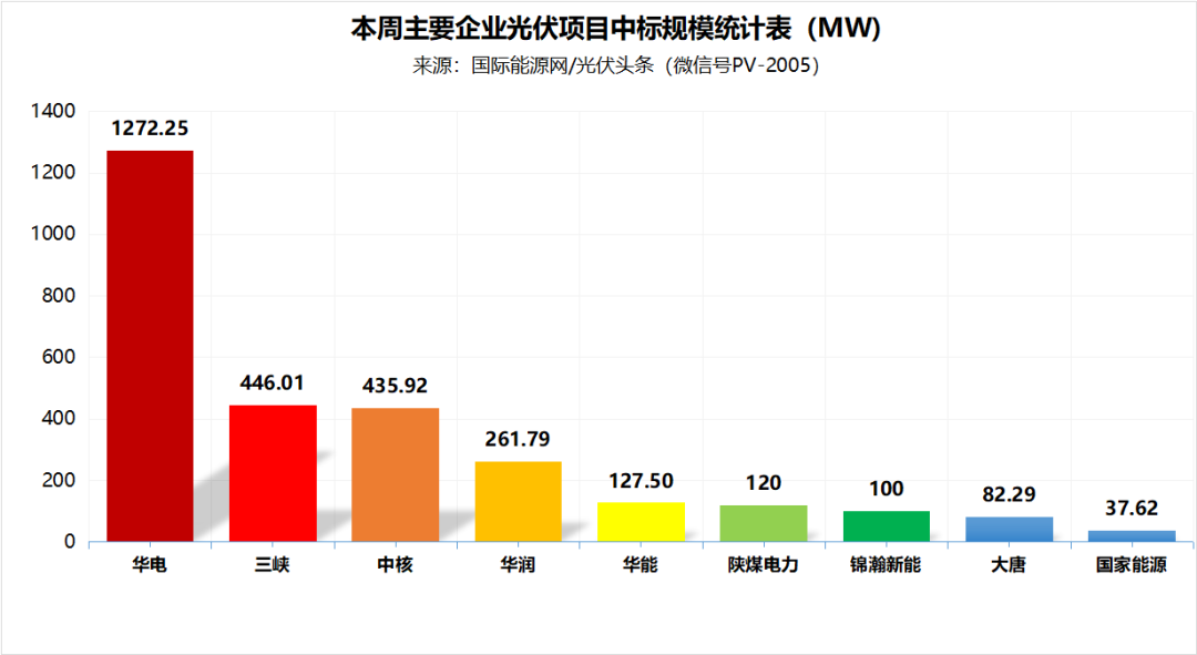 国际能源网/光伏头条(PV-2005)统计本周华电、三峡、中核、华润、华能、大唐、国家能源集团等企业发布了37个中标项目,总规模2883.37MW。其中,华电以1272.25MW位列第一,三峡以446.01MW排名第二,中核以435.92MW位列第三。