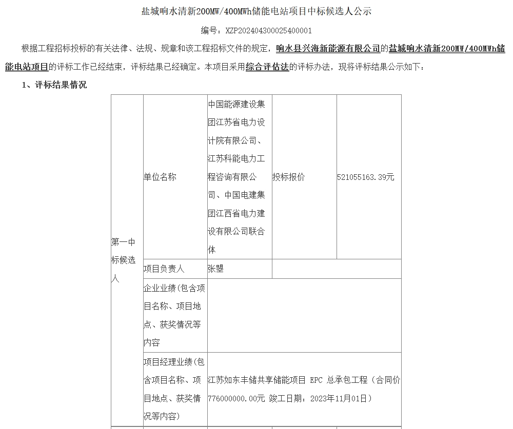 5月31日,江苏响水县政府发布盐城响水清新200MW/400MWh储能电站项目中标候选人公示。公告显示,中国能源建设集团江苏省电力设计院有限公司、江苏科能电力工程咨询有限公司、中国电建集团江西省电力建设有限公司联合体预中标该项目,投标报价521055163.39元,折合单价1.303元/Wh。