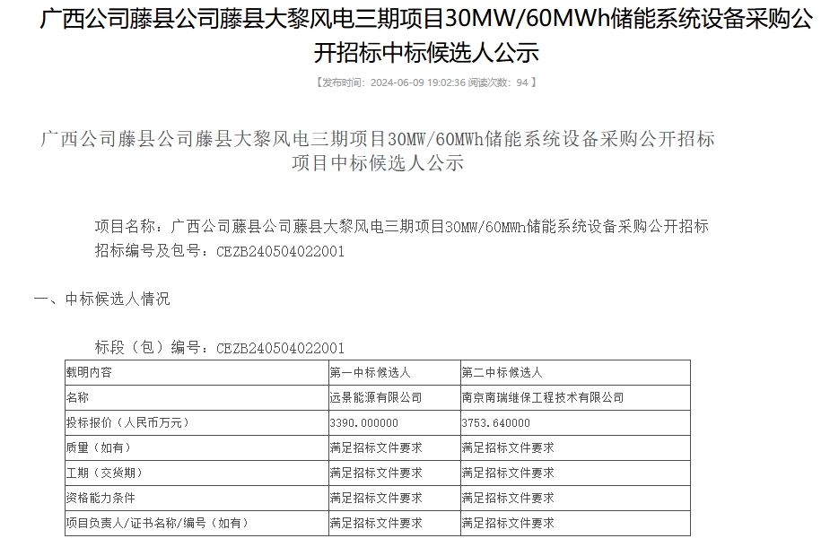 6月9日,国家能源集团发布广西公司藤县公司藤县大黎风电三期项目30MW/60MWh储能系统设备采购公开招标中标候选人公示。中标候选人情况如下: