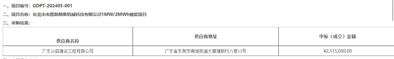 6月12日,东莞市宏辉新精密机械科技有限公司1MW/2MWh储能项目采购结果公告发布,广东众森建设工程有限公司以251.5万元中标该项目,折合单价1.258元/Wh。